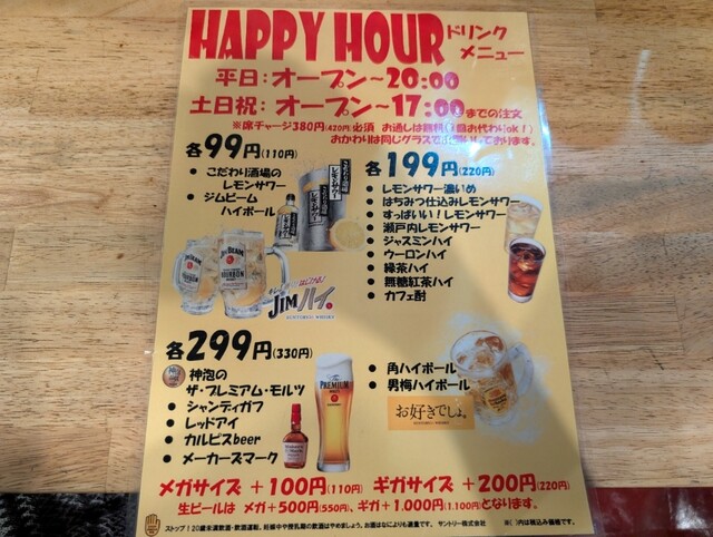 | サービス | 2時間半以上の宴会可、お祝い・サプライズ可、ドリンク持込可、ペット可、テイクアウト |