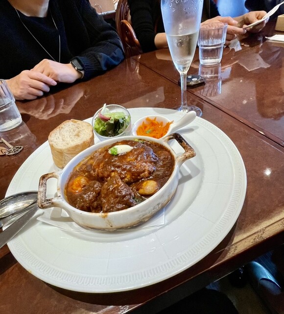 煮込みハンバーグと牛肉の赤ワインソースとスパークリングワインを注文しました...