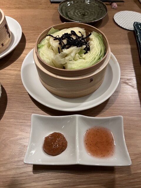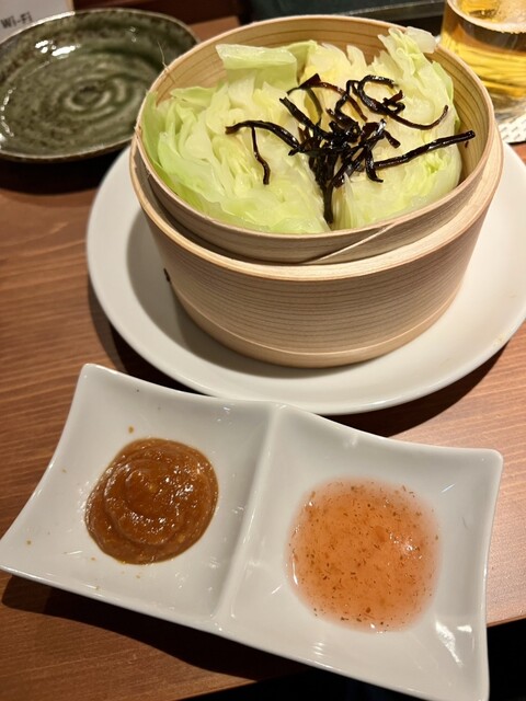ただのキャベツじゃなくて、せいろで蒸してあるひと手間が最高。にんにくタレと梅タレの2種類で食べるのですが、これだけでお酒が進みます。