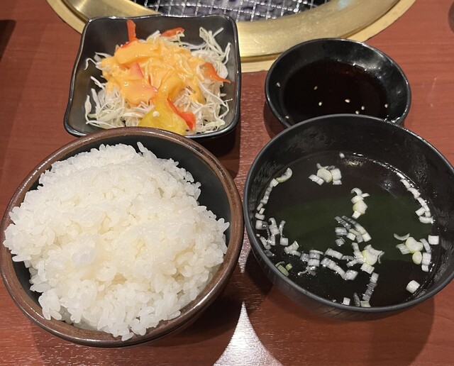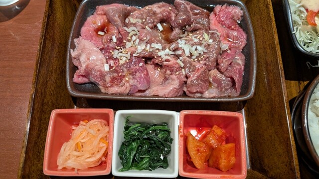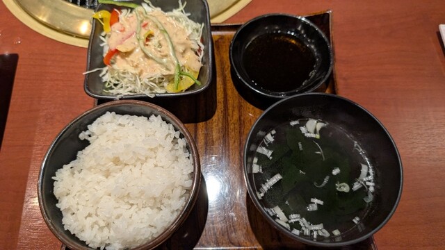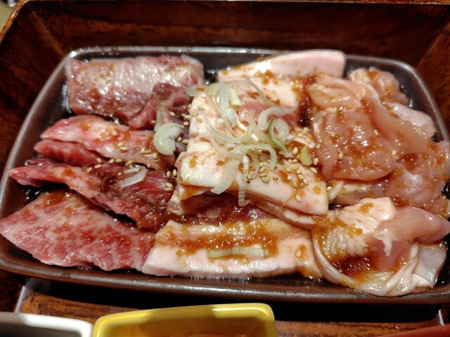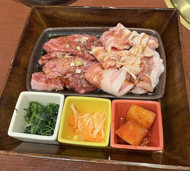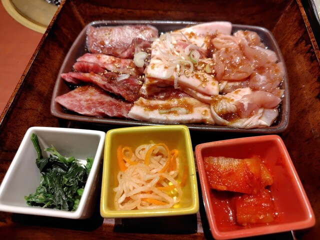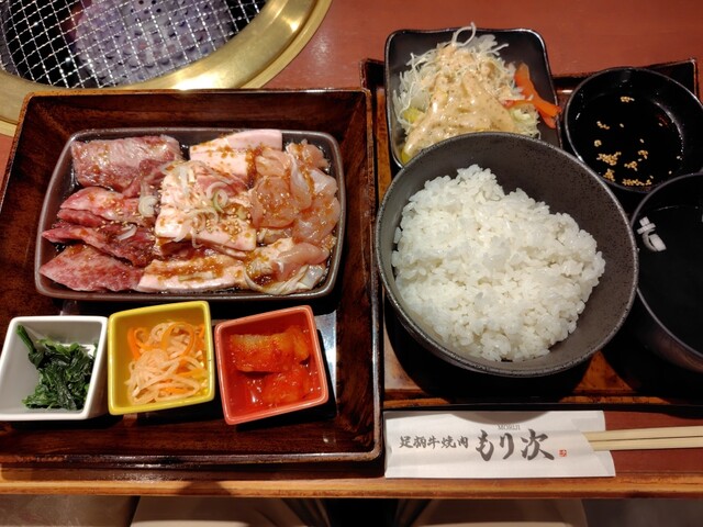 同僚を誘ってお昼時に伺いました。フレッシュな店員さんにテーブル席へと案内され、メニュー表を見ました。同僚と話をしているうちに、もり次ランチが良さそうとなり、QRコードで注文し間もなくして配膳されました。2段でお重のような感じで、上段がご飯大盛りとわかめスープ、サラダ、タレとなっていて、下段には、鶏肉、ポーク、カルビの肉の盛合せとキムチ等のナムル類でした。お肉は見た目200グラム位はあるのかなと思い... 詳細を見る