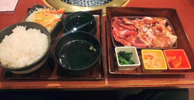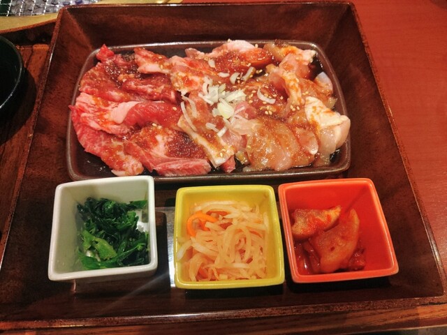 同僚を誘ってお昼時に伺いました。フレッシュな店員さんにテーブル席へと案内され、メニュー表を見ました。同僚と話をしているうちに、もり次ランチが良さそうとなり、QRコードで注文し間もなくして配膳されました。2段でお重のような感じで、上段がご飯大盛りとわかめスープ、サラダ、タレとなっていて、下段には、鶏肉、ポーク、カルビの肉の盛合せとキムチ等のナムル類でした。お肉は見た目200グラム位はあるのかなと思いました。早速、同僚と陣取り合戦もどきで、つまらない焼き場争いをしつつ、仕事の話をしながら沸き上がるのを待ちました。3種類のお肉をそれぞれいただきましたが、どれも柔らかく適度な脂で美味しいです。そして、ご飯。これが個人的な好みで固めで甘味があり美味しく、焼き上がったお肉と一緒に食べると、無料の大盛りご飯があっという間に完食となりました。無料でスープと一緒にライスもおかわりして、お腹いっぱいになりました。同僚も大満足して、会計後はテイクアウトのコーヒーをいただきました。とても美味しい焼肉ランチでボリューミーでありながらコスパも良かったです。