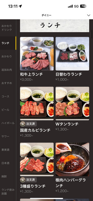 ランチ利用です。A5ランク宮崎牛カルビランチ(1,600円)をオーダー。