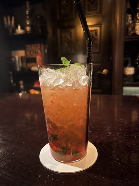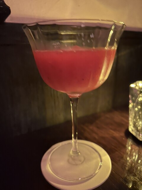店内はカウンターとテーブルが何席か。私はいちごのフローズンカクテルとジントニックを注文。いちごのカクテルはアルコール感はほとんどなくデザート感覚で。ジントニックは皮の...