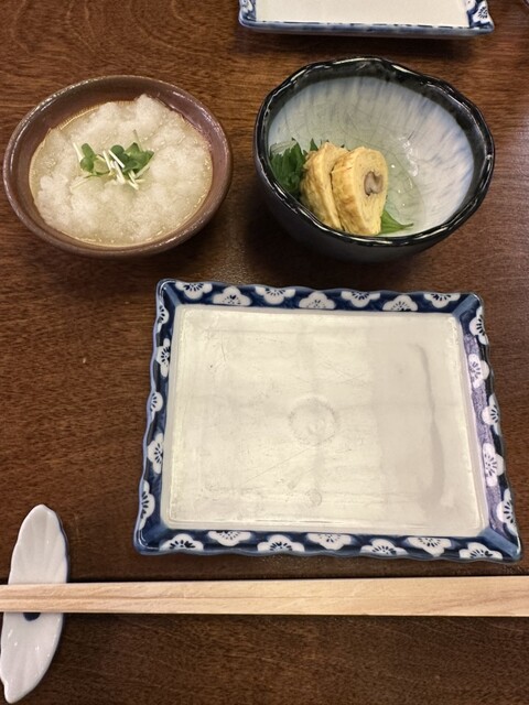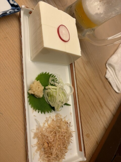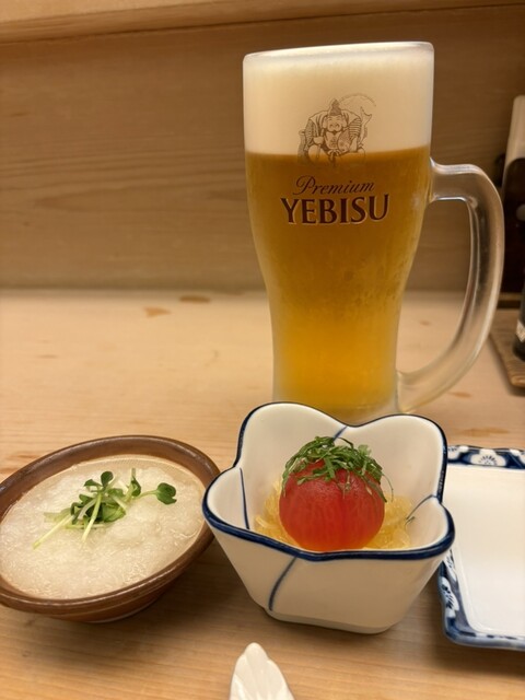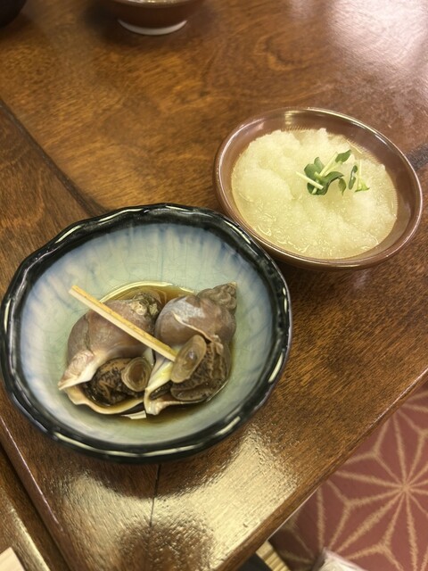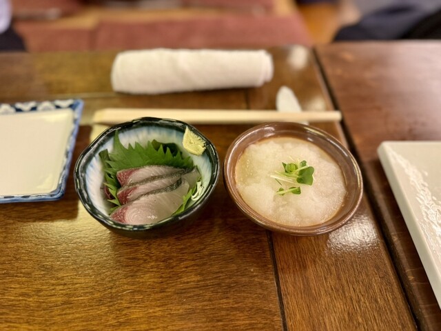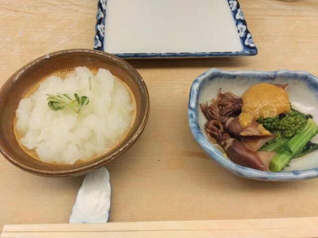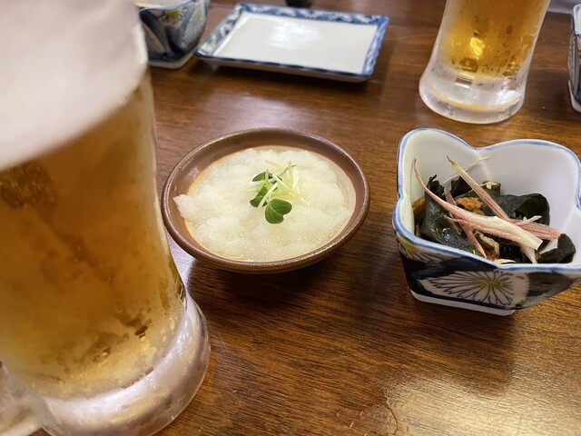お通しはまぐろの山かけと大根おろし。 焼鳥を注文し、焼きあがるまでのつなぎとしてのつまみに最適。
