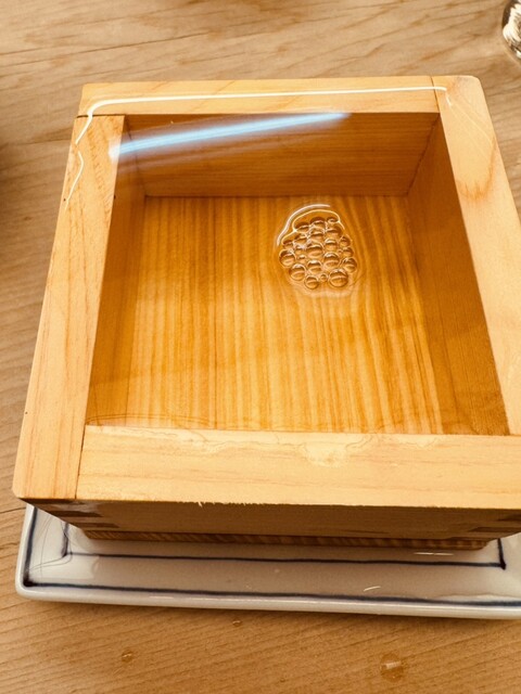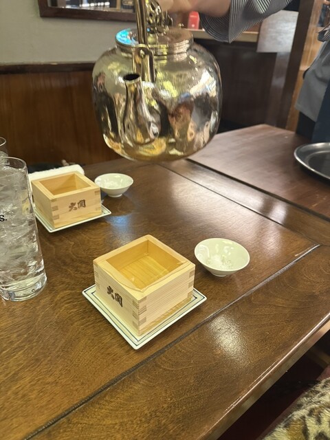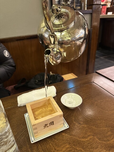 ますで飲む日本酒は美味しいと思うんですが、樽酒をオーダーすると、やかんで升にお酒を注いでもらえます。