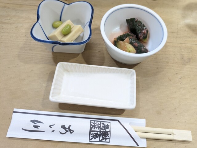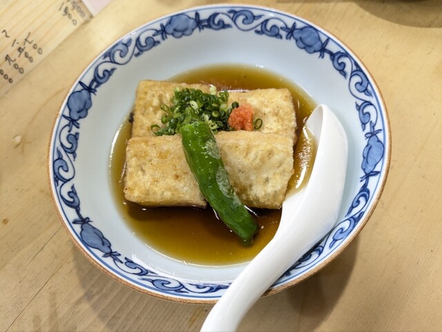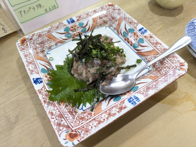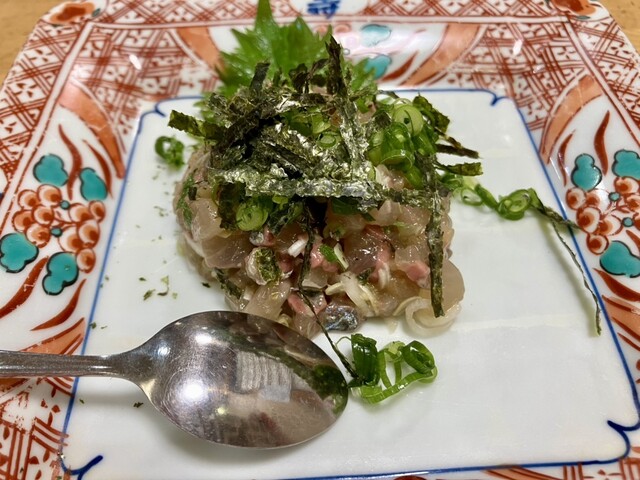お通しが2品、お豆腐の上にオクラ?ネバネバの物とマグロの中落ちっぽい2品、味は普通ですが2品出るのは嬉しいです。