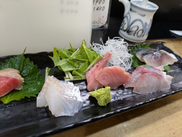メニューをみると海鮮がメインなので、お造り5種盛りと孤独のグルメからの芋まんじゅうバター、天ぷら...