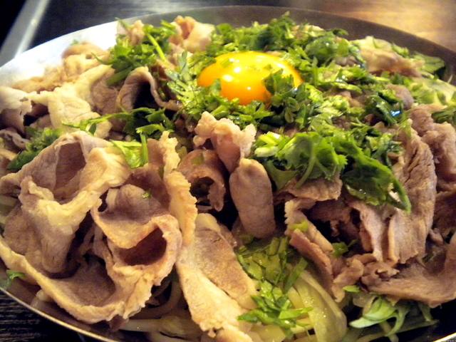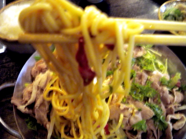 それから出てまいりました冷麺ですが、これがすごい。麺の上にレタスの千切りが乗っていてその上に豚肉の冷しゃぶが乗っています。この豚肉の量が麺を覆い隠すほどの量ですよ。その上に香菜が散らしてあり、卵の黄身がのっているというものです。これで@500円はお安い気がいたします。また、別のお方の鍋もチラ見いたしましたが大量の具材でしたねぇ。こちらも800円では考えられないという感じでしたよ。