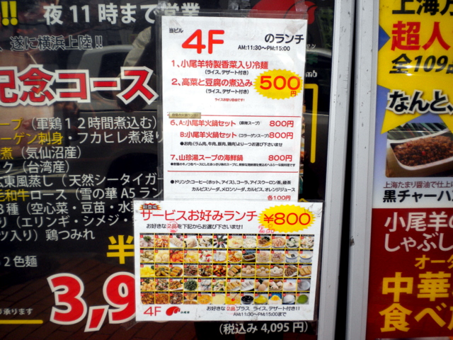 入店の仕方は毎度のことですが、まずは金香楼さんに入りまして(ここしか出入り口がないんです)入口すぐのエレベーターで4階へ、もし金香楼さんの店員さんと会ってしまったら4階へ行きますと告げるだけでよろしいですよ。4階に上がりますと適当な席に案内されまして、そこでランチのお品を再確認いたしますと、4.肉たっぷり四川風冷麺@500円というお品があるじゃぁありませんか。これは四川とあるだけにピリ辛でしょうとこちらを注文することにいたしました。またその他には鍋系のランチが3種類、これは@800円ですがそういうものもありましたよ。
