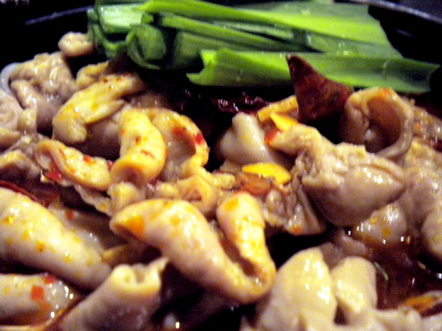 あったまってさあいただきましょうと先ずはスープから。うん、まあ辛いことは辛いけどそれほどではないなぁというのが最初の感じでした(後でどんどん大変なことになってくるんですが)。モツはちゃんと処理がされていまして美味しいものですよ。でどんどん食べていって気がついたんですがスープには花椒も入っていますしニンニクを細かく刻んだものも入っています。これらが時間が経つとエキスが染み出てきたのかどんどん辛くなってくるんですねぇ。