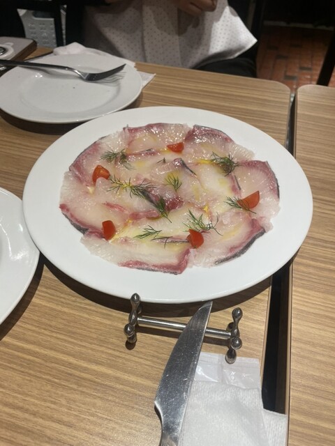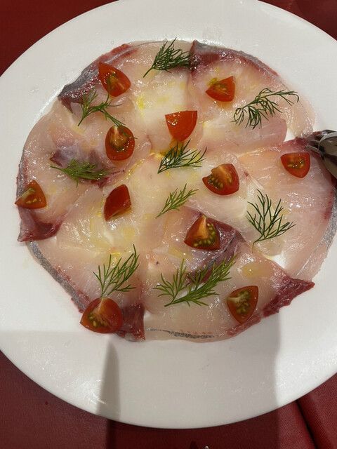 まずは、生ハムが入ったアミーゴ風サラダで乾杯後、本日の鮮魚のカルパッチョはハマチ、ん?鰆?濃厚な魚が、さっぱりとドレッシングされています。