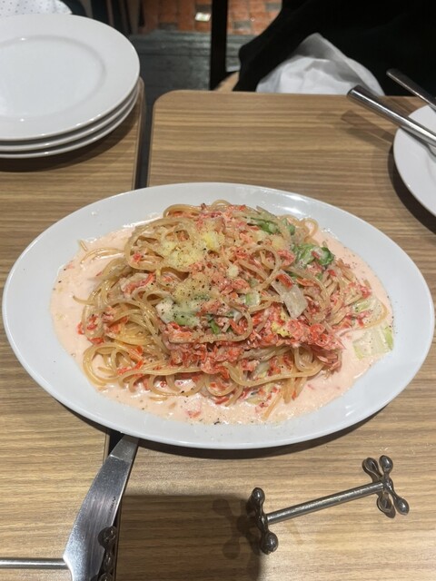 〆の本日のスパゲッティは、桜エビのクリームソース、香ばしい桜エビと濃厚なクリームソースに麺が絡まり、お腹いっぱいだけどいくらでも入ってしまう。