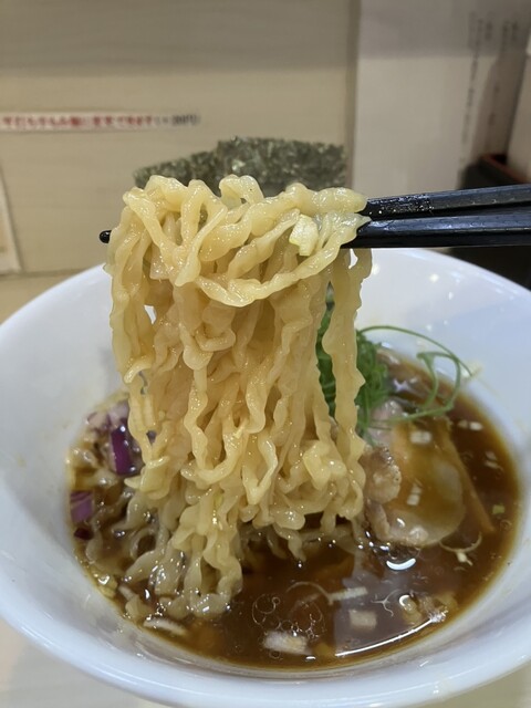 くじらという名前を聞くと挑戦しにくいですがいざ挑戦。細麺ではありますが、説明は難しいですがこれまた独...