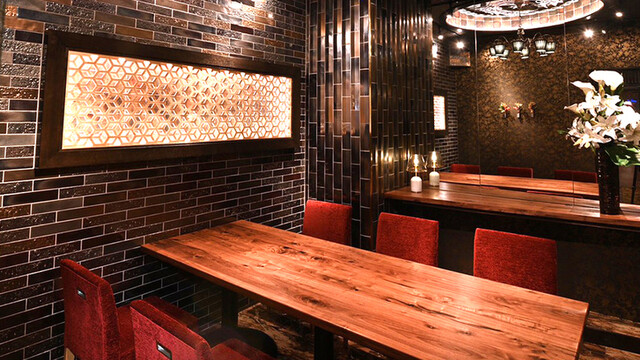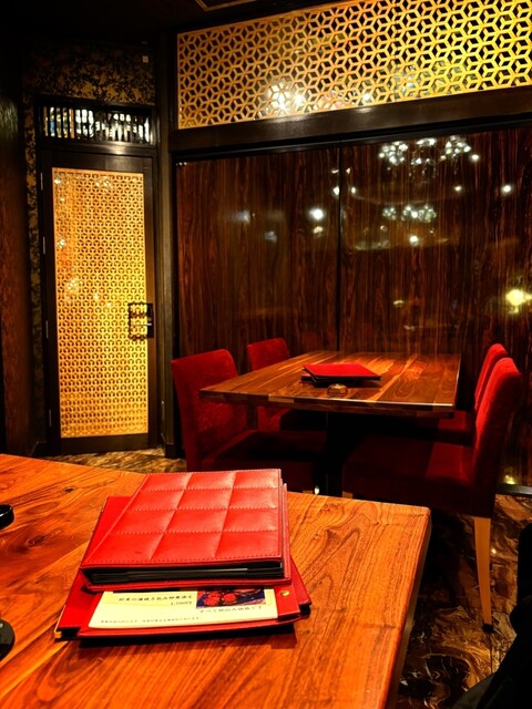 入口の階段を降りて店内に入りましても、個性的な雰囲氣は変わらず、煌びやなアジアンテイストで、お通しいただいた部屋名も玄武...
