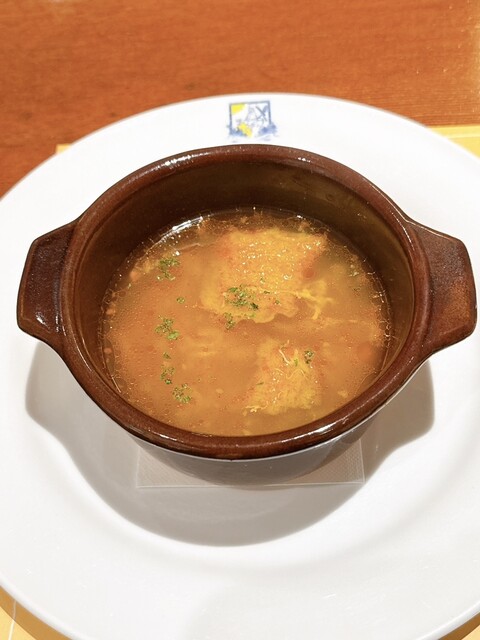前菜は熱々のオニオングラタンスープを。寒い日だったので、体がホッと温まります。
