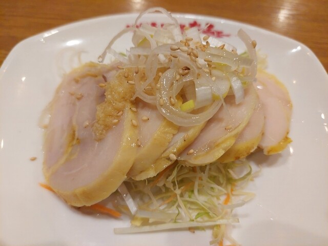 仕方ないので瓶ビール500円にする。そしてアテを2品、皿ワンタンと蒸し鶏サラダ(いずれも380円)。