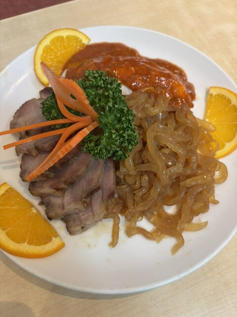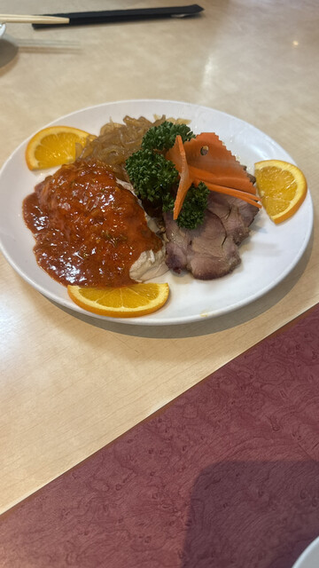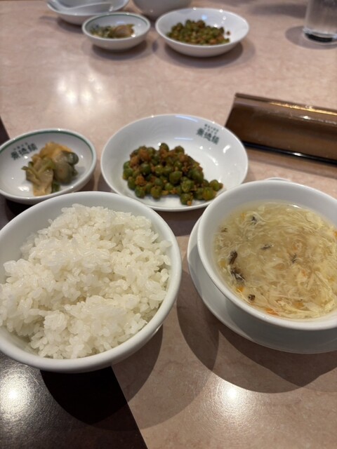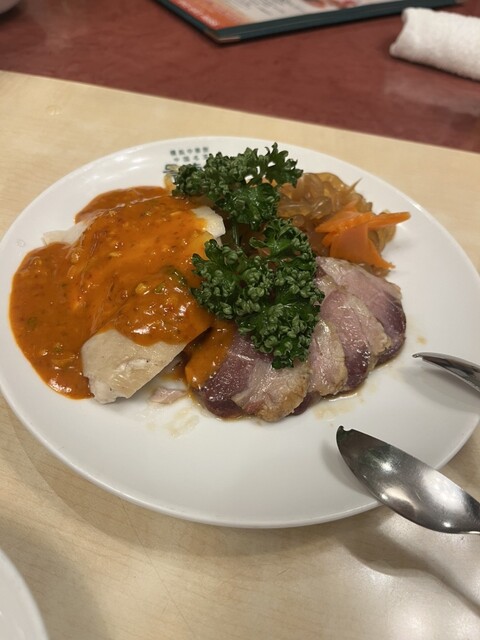 蒸し鶏の冷菜、魚の揚げ物、点心、スープのついた、麻婆豆腐のセットを頂きま...
