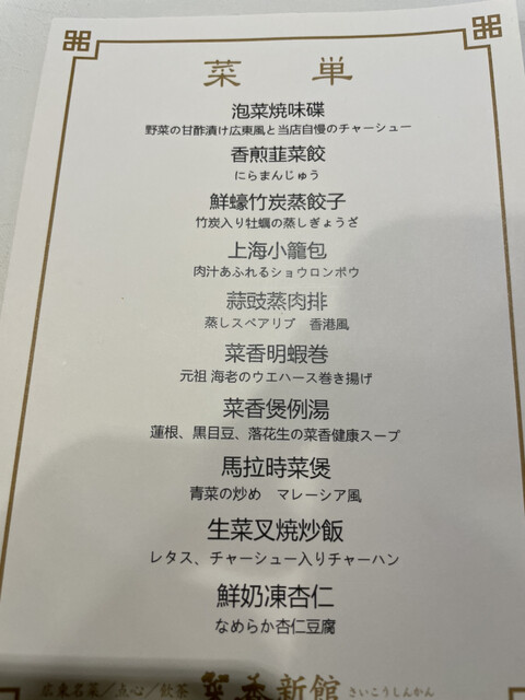 菜香新館のランチコースは、ひと皿ごとに「丁寧につくられている」という安心感があり、肩肘張らずに本格中華を楽しめる内容だった。前菜は香りや味のバランスがよく、食事への期待を自然と高めてくれる。点心は皮の...