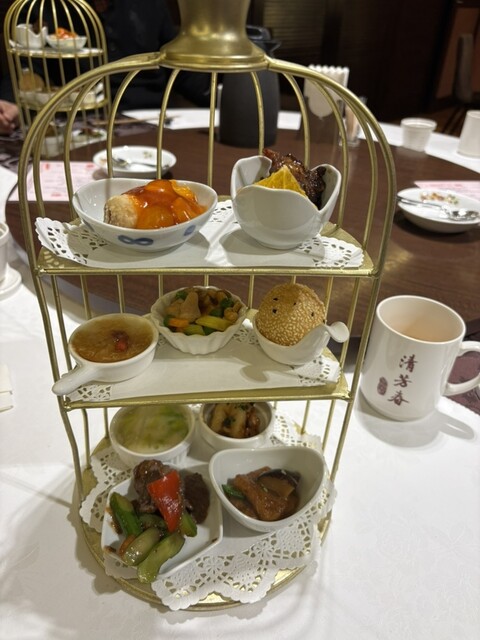 アフタヌーンティーの台にすこしづつ中華の一品料理が14皿、胡麻団子、おかゆ、杏仁豆腐もついてて、3種類の中国茶が選べ何度も差し湯しても味があり何杯でも飲めた。ゆったりとした空間でお料理も美味しく、おか...