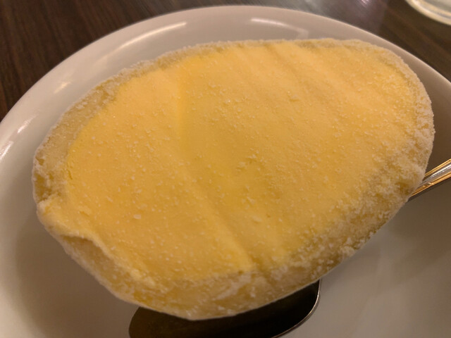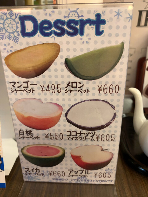テーブルに美味しそうなフルーツシャーベットの写真が置いてあったのですが、お店の作戦にまんまとハマって、マンゴーシャーベットを注文してしまいました。生のフルーツを半分に切ってくり抜いたものに、その果物のミルクシャーベットを入れてあるのですが、これが果汁感があって美味しかったです。