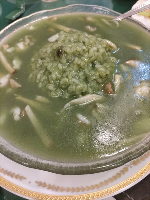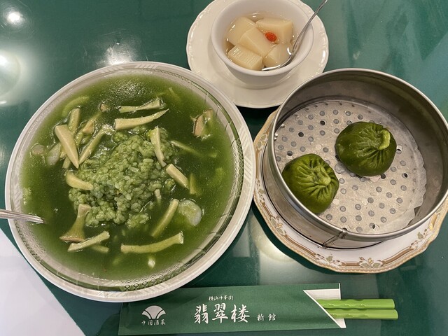 中華街関帝廟通りのほぼ中央に位置する「翡翠楼新館」。80年代の上海をイメージしたシックとモダンな雰囲気。若手オーナーのこだわりが随所に見られるスタイリッシュな空間です。 中華街に行ったら必ず食べたい名物『海鮮翡翠チャーハン』は、食べて綺麗になる炒飯としてテレビで紹介されました。 キレイな緑色のスープチャーハンで、ほうれん草や干し貝柱などの無添加食材を使っているので、カラダにも嬉しい一品になっていま...す。