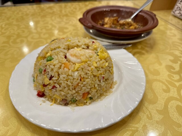 行列もなくすんなり店内のテーブル席へ案内され、名物の陳麻婆豆腐(ハーフサイズ)の激辛と五目チャーハンを注文しました。