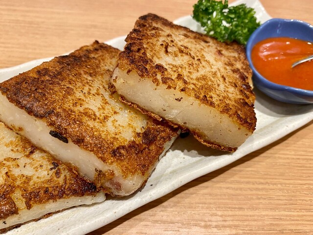 大根もちは、かりっ、ぷるっと、しっかり味がついていて美味しい。付け合わせの辛みと合わせると旨味が更に引き立つ。きちんと計算されているんですね!