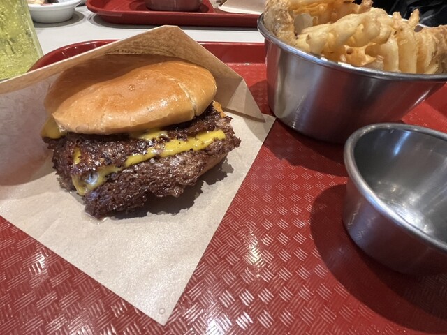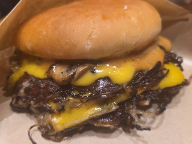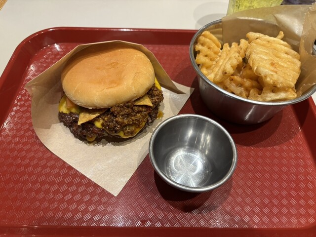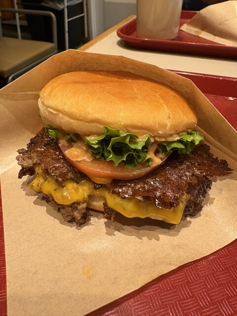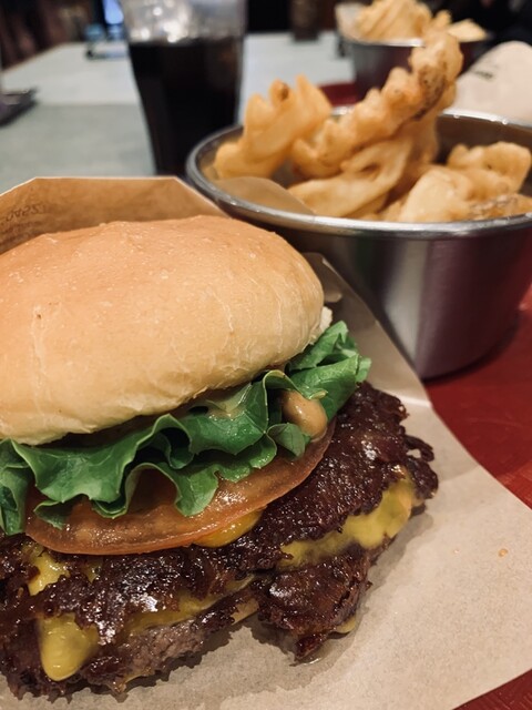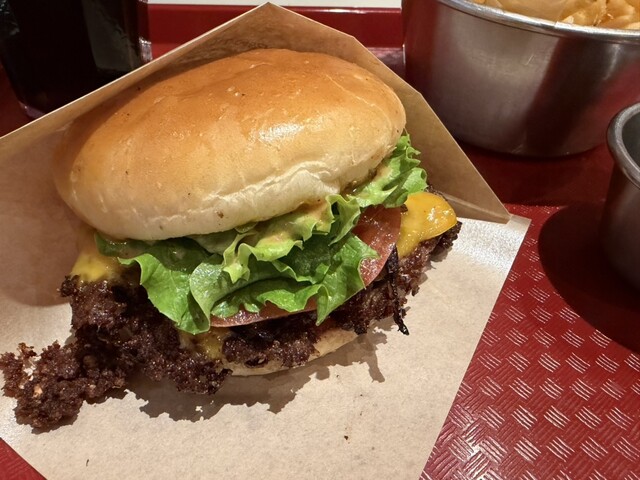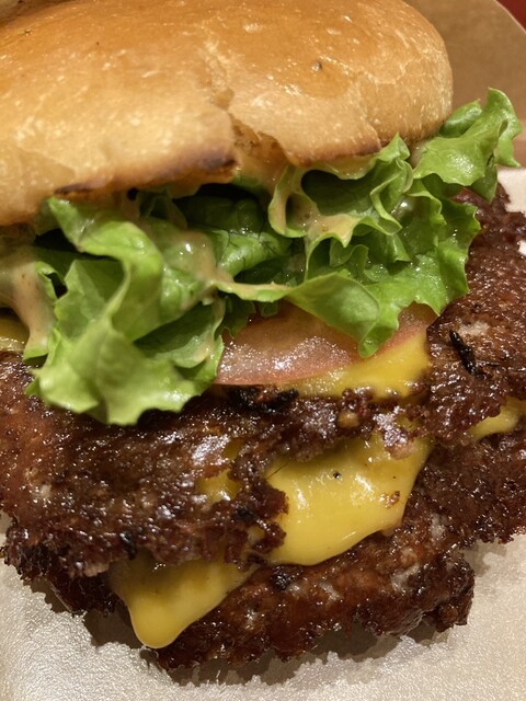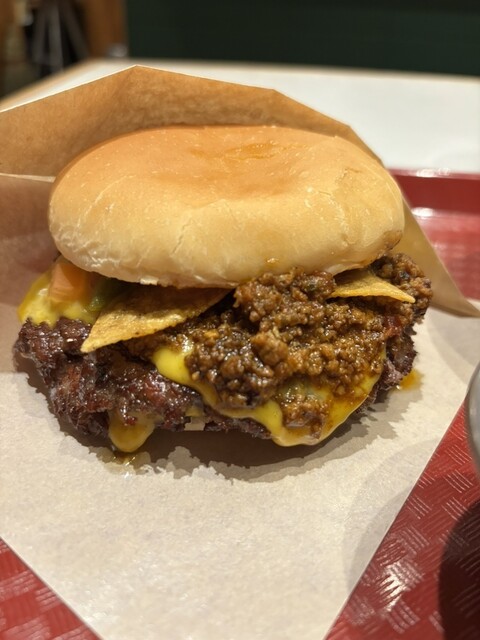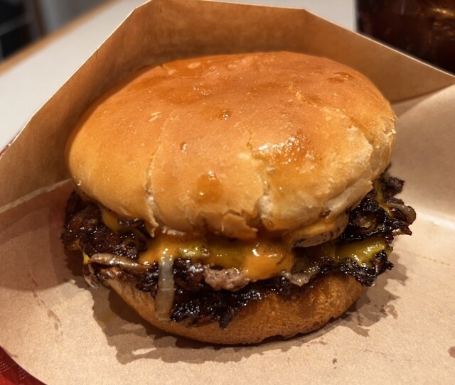 お肉を押し潰すようにギュッと薄く焼いて表面をカリカリにしたスマッシュパティの有名店です。