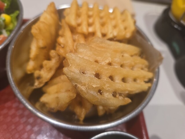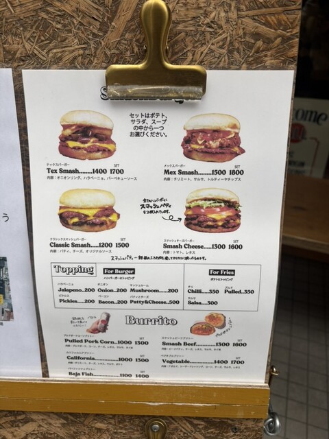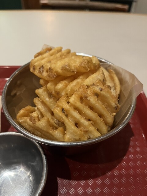 平日昼過ぎに行ったらすぐ入れた。テックスが何か分からないがオニオンリングの入っているチーズバーガーのよう。ハラペーニョ好きなので迷わずテックスを注文。セットはポテトを注文。ドリンクはセット価格で200...