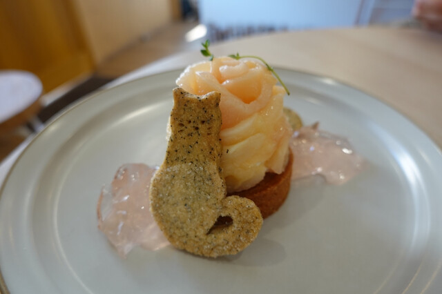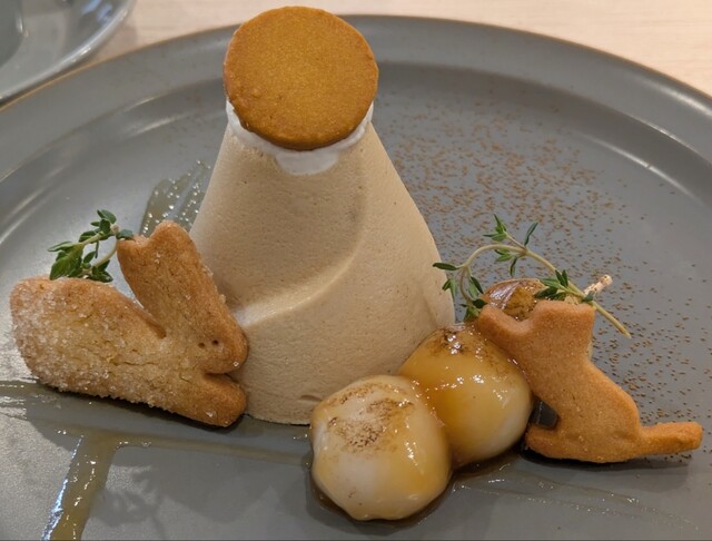 「白ごまムースとアーモンドたっぷりの生地を忍ばせたほうじ茶のムース、かぼちゃの満月サブレ、白ごまのうさぎサブレ、シンプルな子猫サブレに小さなみたらし団子の乗った季節限定のプレートで...