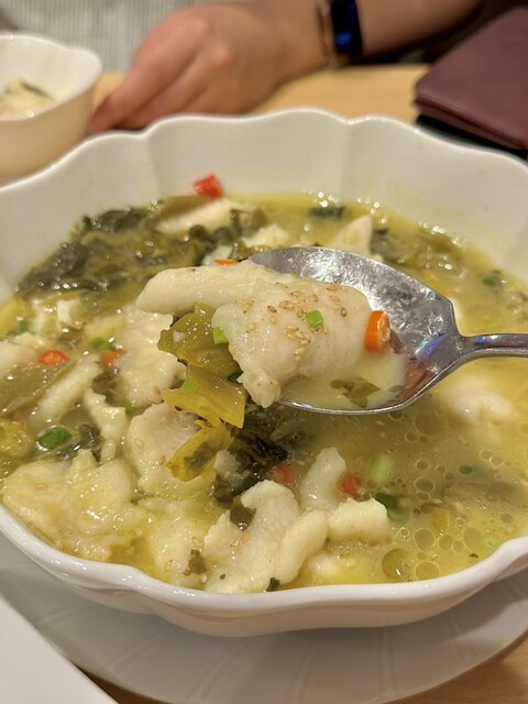 白身魚と高菜の煮込みは唐辛子もたくさん入っており、結構辛い。ひと口食べた時にはそれ程かなと思っていたのですが、あとからカーッと喉が熱くなってきます。辛いものにそれほど強くない私は、唐辛子を避けつつちびちびいただいていきます。辛いものが大好きなRはザクザク食べてます。満足そうで良かった。