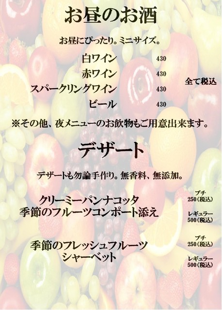 | 料理 | 野菜料理にこだわる、魚料理にこだわる、英語メニューあり |