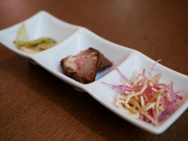 ランチは食前食後にドリンクの付く特有のプリフィクススタイル。3種の前菜もすべてのメインディッシュに付いてきます。この日は搾菜と叉焼、豆腐干の和え物でした。食前のドリンクは折角なので+250円でスパークリングワインをチョイスです。