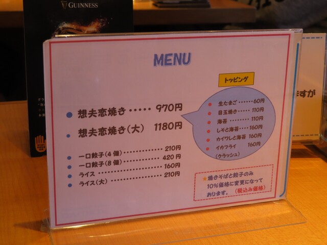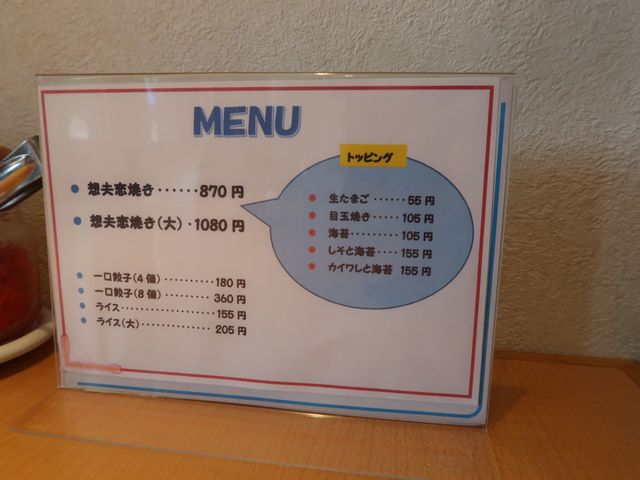 私は想夫恋焼き(大)に目玉焼きと海苔をトッピング、それに一口餃子(8個)を頼みました。