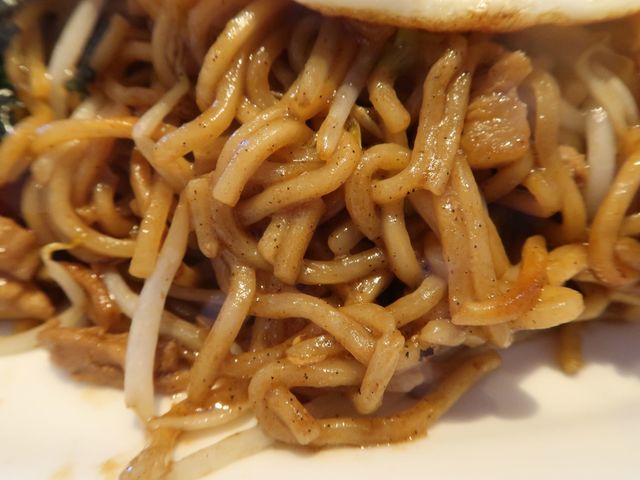 普通の焼きそばに目玉焼きと海苔をトッピング