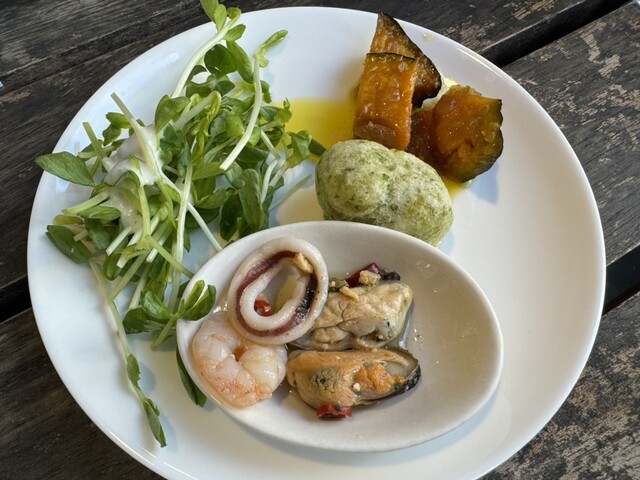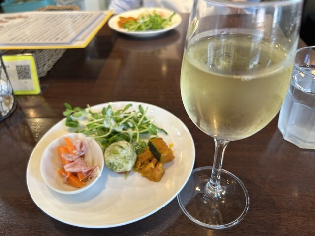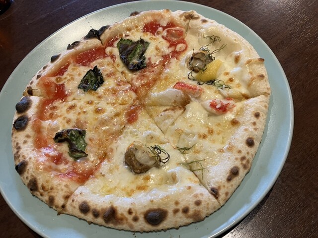 ランチメニューの中からピザのハーフ&ハーフでマルゲリータとオホーツク産ズワイガニとホタテのレモンクリーム1,730円をオーダーしました。 前菜とドリンクが付きます。前菜は4種... 詳細を見る