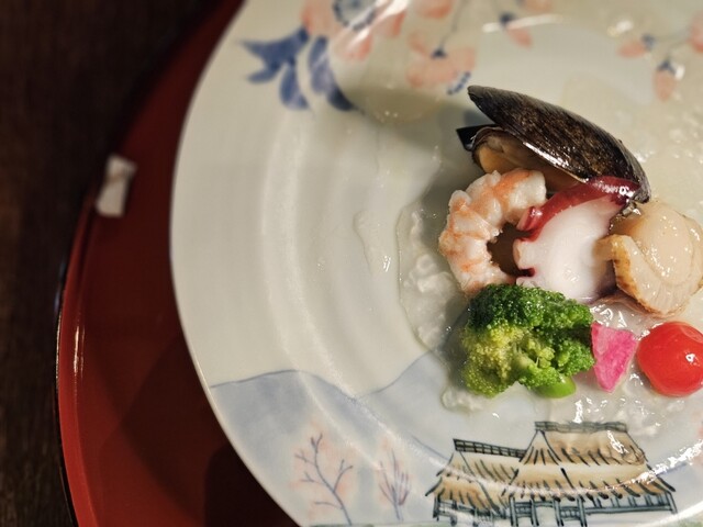 ・秋鮭のあられ揚げ あられが香ばしくかりかりで、中にしっとりとした秋じゃけ 優しいお椀からスタート ・魚介のオリーブオイル 和風ゼリー寄せ 柔らかく煮た帆立 えび... 詳細を見る