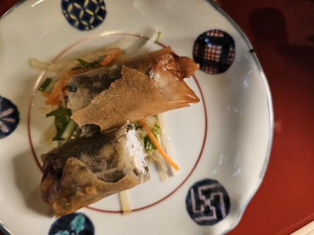 梅の酸味は少なめ、ほくほくの魚とほのかな塩味で頂く揚げたてのパリパリ春巻き
