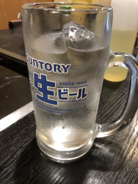 厨房で店主さんが焼いてくれています。中ジョッキで水が...
