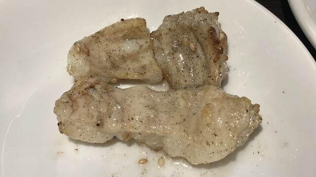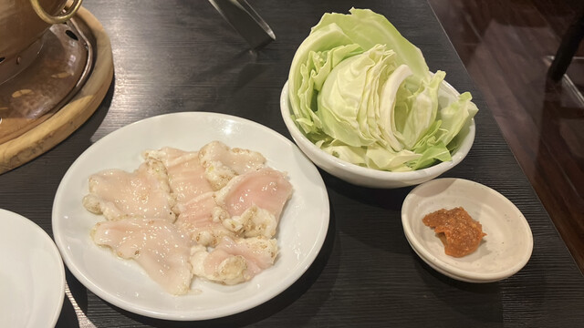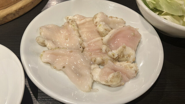 税抜価格になっていて不親切なメニュー、とりあえず一番人気の和牛ホルモン塩味680円+税とレモンサワー420円→210円+税にしました。お通しキャベツ200円+税も運ばれてきました。