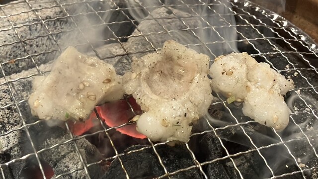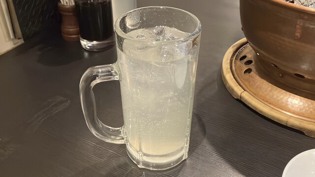かんぱい!レモンサワーは普通です。氷が多くて量は少ない。七輪でホルモンをじっくり焼...