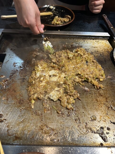 お好み焼きはお店の人に頼んで焼き上がったものを持ってきてもらうことにして、自席の鉄板で...