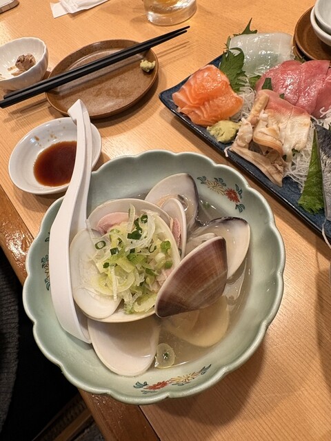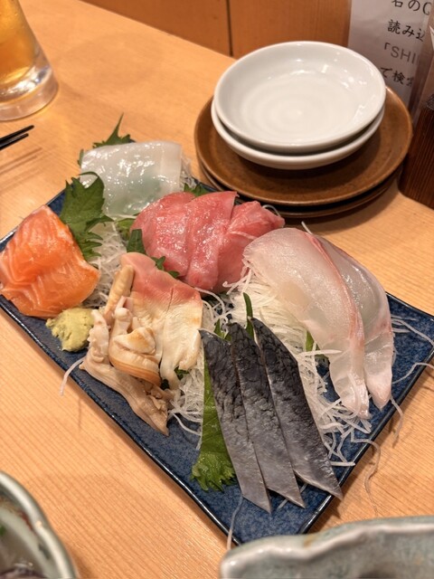 刺身の盛り合わせ、酒蒸し、あん肝などを注文。店名どおり魚の鮮度は安定してい...
