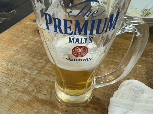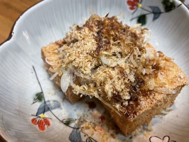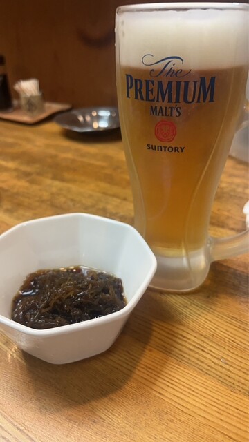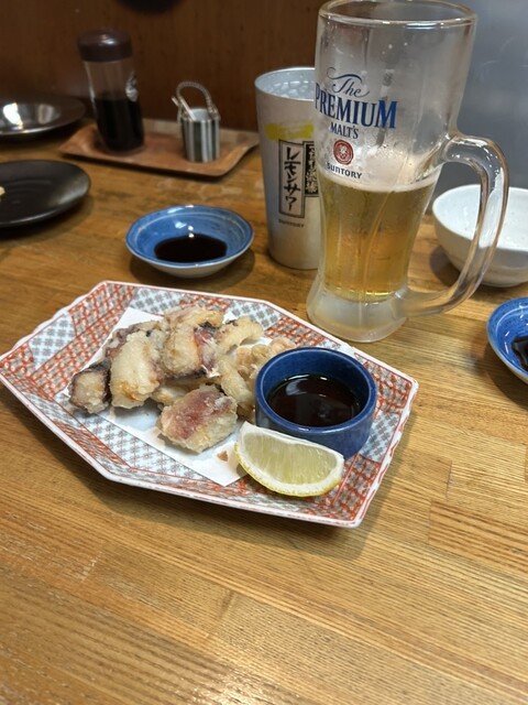 この日はお通しにイカの塩辛、厚揚げ豆腐、たこ唐、瓶ビール(アサヒスーパードライ※生ビールはプレミアムモルツ)と芋焼酎、麦焼酎をそれぞれロックで頂きました