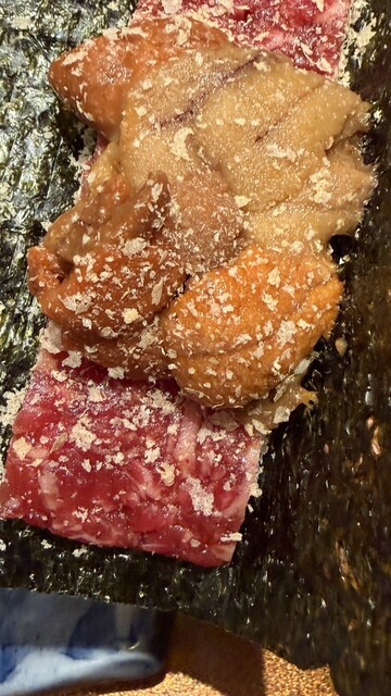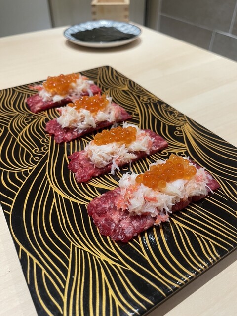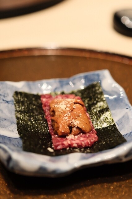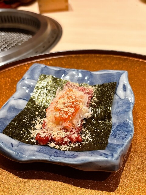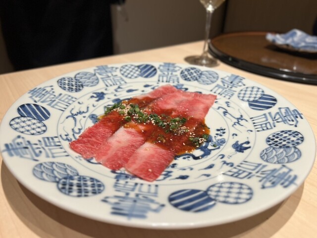 高級感ある清潔な店内での食事はいつも以上に美味しく感じた。また目の前でお肉をやりてくれる豪華なサービス。お肉がとにかく柔らかく、脂身も程よくのっていて最高。最終で入店したためか、コース料理の提供ペース...