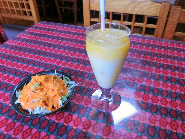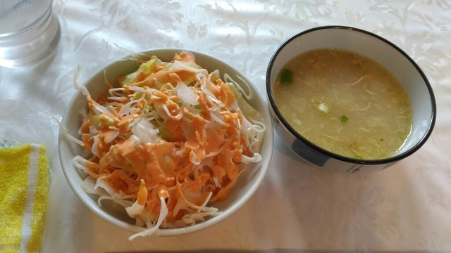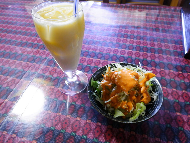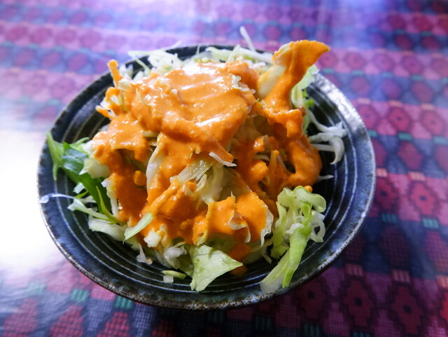 サラダがまず提供され、キャベツ・レタス・水菜?が入っており、オレンジ色のドレッシングがかかっています。