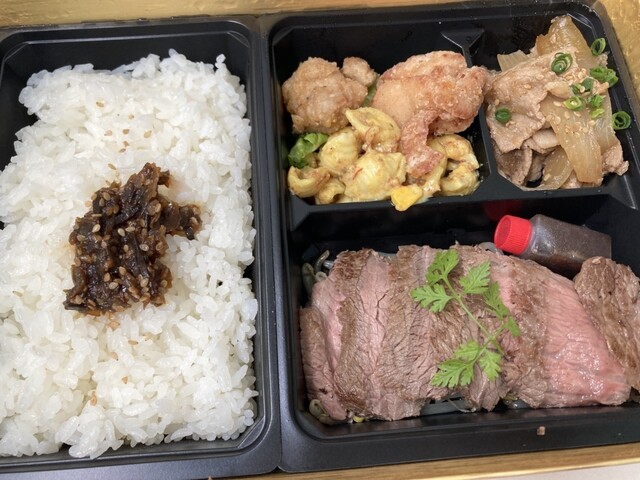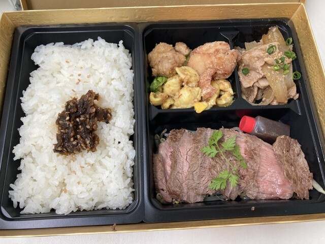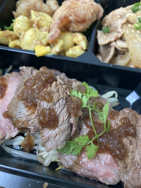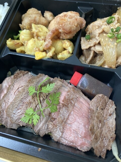 月・水・金・日曜日 ・サラダ ・近江牛スライスステーキ ・豚の生姜焼き ・塩だれチキン ・ライス ・味噌汁 ・香の物 火・木・土曜日 ・サラダ ・近江牛赤身レアステーキ ・豚バラおろしポン酢 ・照り焼きチキン ・ライス ・味噌汁 ・香の物