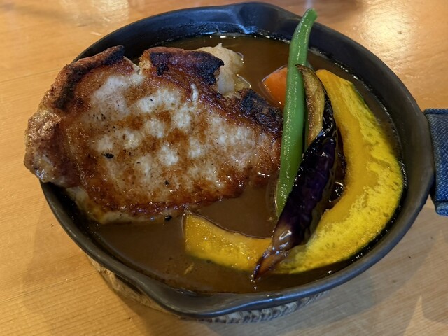 札幌のカレー百名店2022は全店食べたことがありますが、札幌発のスープカレーとは明らかに違うカレー。絶妙なスパイスのミックスが何とも言えない独特のコクを生み出してます。札幌スープカレーは、あまりガツンとしたスパイス感はなく、有名店も出汁をウリにしている感がありますが、アルペンジローは違います。スープなんだけど、スパイスがめちゃくちゃガツンと来ます。これが他では味わえない感覚なんです。私の語彙量ではこれ以上うまく説明できませんが、他では食べたことのない味で、明らかに札幌スープカレーではありません。