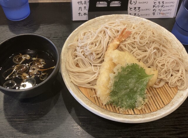 天ざるはエビ、イカ、大葉の天ぷらが付いてます。ノーマルの大もりと比べると550円の差額です。なかなかしますねー。天ぷらの大き...