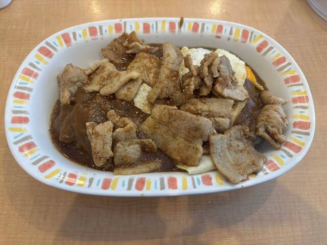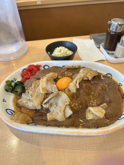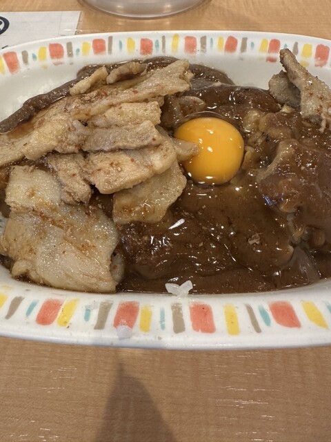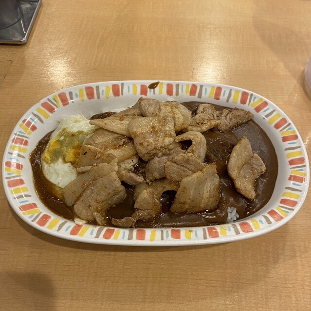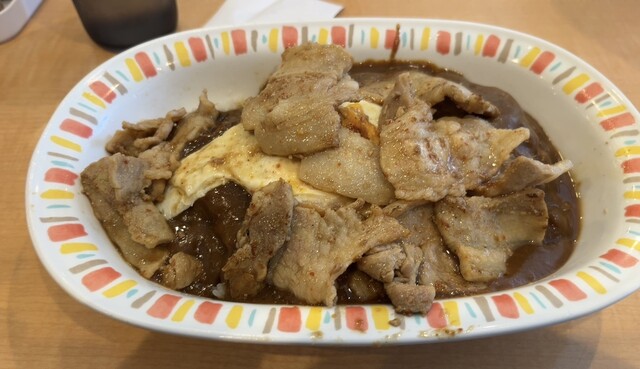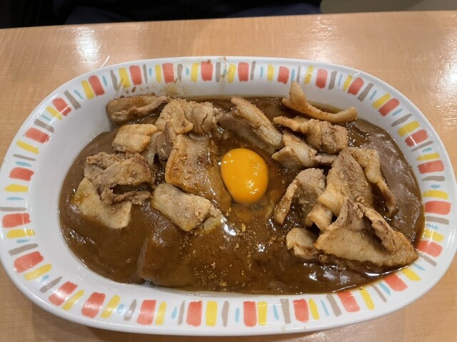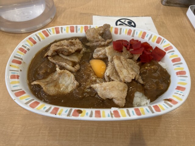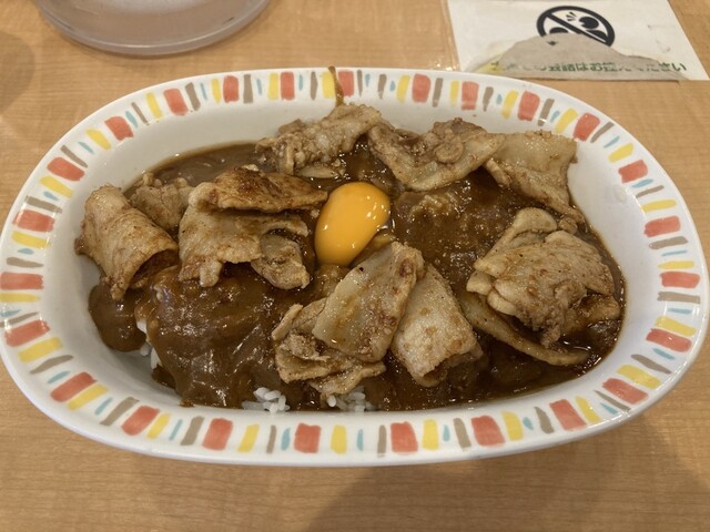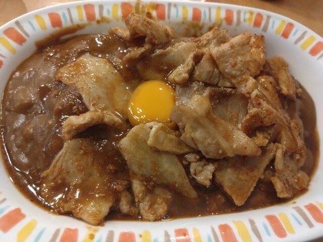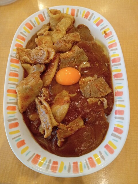 ガッツリ食べたい時に最高の一皿でした。カレー自体はコクがあって親しみやすい味ですが、上に乗った豚肉炒めと生卵のパンチがすごいです。ニンニクの香りが食欲を刺激して、スプーンが止まりませんでした!